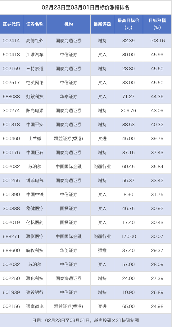 高德红外目标价涨幅超108% 阿拉丁、海光信息评级被调低丨券商评级观察