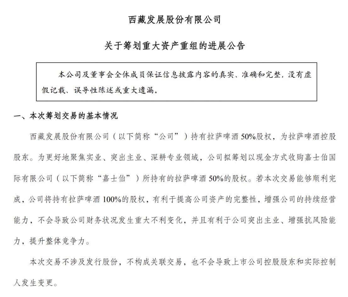 11月25日,西藏发展发布《关于筹划重大资产重组的进展公告》,称其持有拉萨啤酒50%股权,拟现金收购嘉士伯所持该公司另50%股权,交易完成后,将实现对拉萨啤酒的100%控股,有利于突出主业,提升整体竞争力。