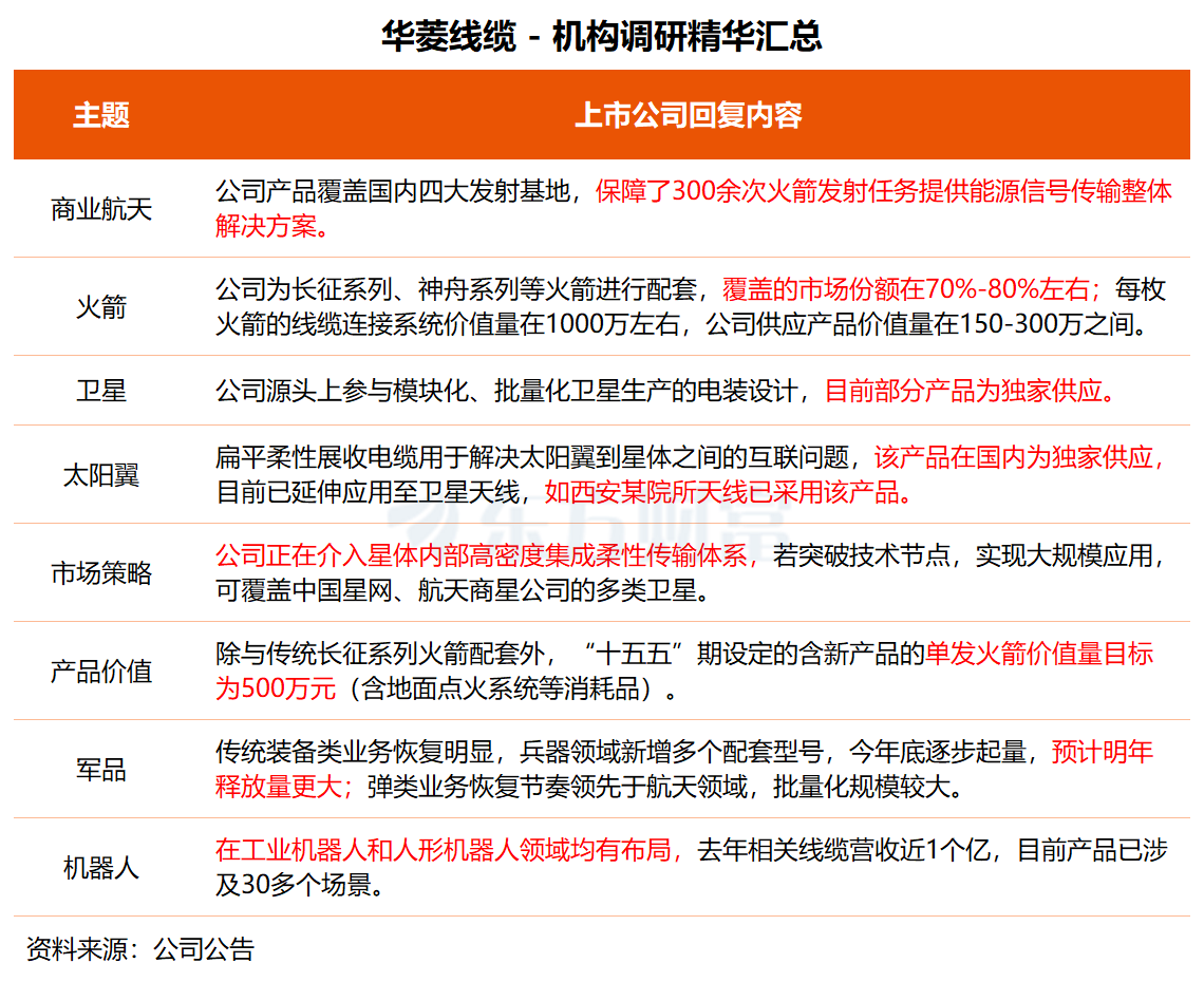 在调研中,华菱线缆透露,公司产品覆盖国内四大发射基地,已保障300余次火箭发射任务。火箭方面,公司为长征系列、神舟系列等火箭进行配套,覆盖市场份额在70%-80%左右;卫星方面,公司源头上参与模块化、批量化卫星生产的电装设计,目前部分产品为独家供应。