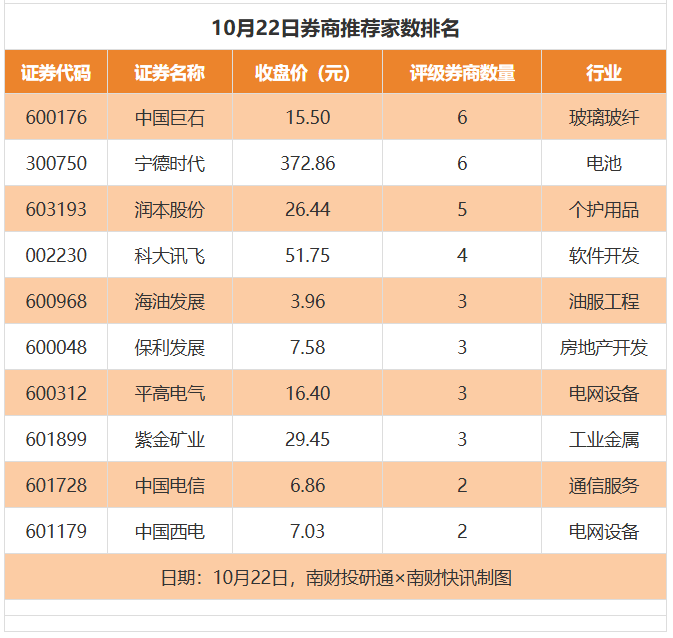 从券商推荐家数来看,10月22日有65家上市公司得到券商推荐,其中中国巨石获得6家推荐,宁德时代获得6家推荐,润本股份获得5家推荐。