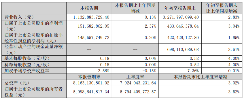 虽然公司前三季度营收利润双增,但是单季度来看,公司盈利承压,增长动能明显放缓。第三季度,公司营业收入为11.33亿元,同比微升0.13%;归母净利润为1.52亿元,同比下降2.37%;扣非归母净利润为1.46亿元,同比上升0.2%。