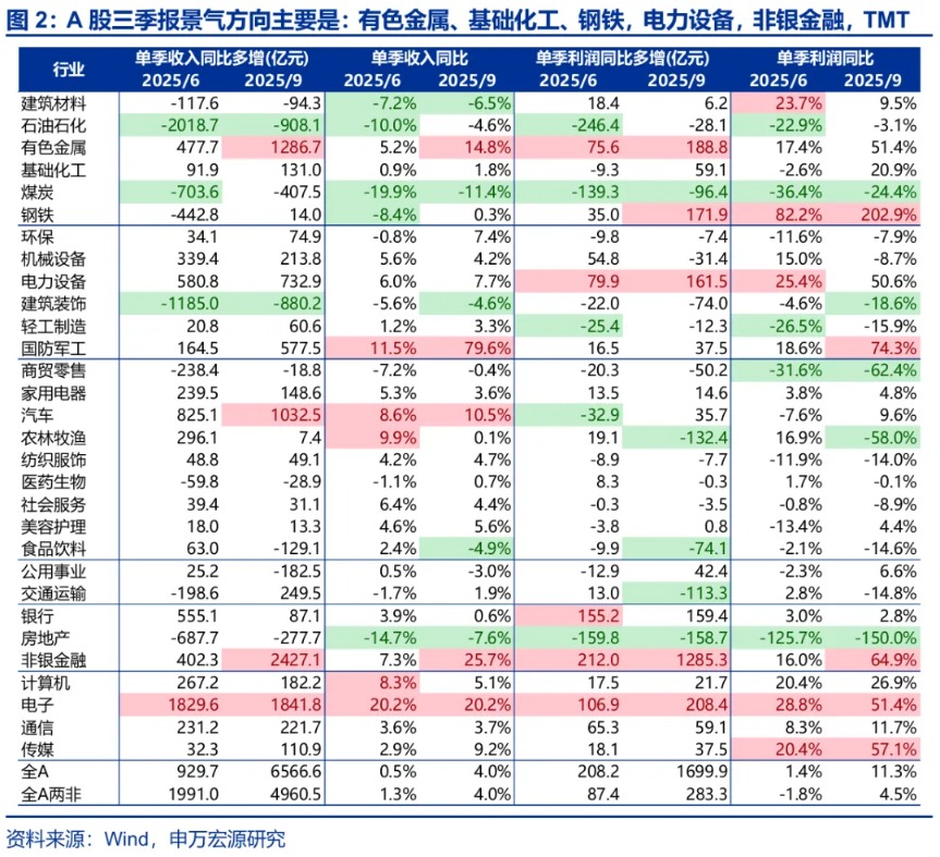 A股三季报收官。宏观偏弱,但A股盈利有亮点的格局延续。二季报是PPI同比回落,但中游制造的营收和盈利能力却企稳回升。而三季报是名义GDP回落,但总体、上游周期和中游制造的营收和净利润增速均出现了改善。且这种改善是在固定资产周转率(供需格局)仍在下行的情况下出现的。2022年以来,上游周期和中游制造的供需格局持续偏弱,微观上企业也在不断调整,适应高度内卷的环境。而25年一季报以来,随着内卷强度的下降,A股盈利能力就率先出现了企稳反弹。所以,尽管A股总体周转率改善的节点可能要等到26年中,但在此之前,A股总体盈利能力不再向下。本轮A股盈利底部区域从25Q1开始,目前已基本确认。A股营收和利润改善幅度较大的行业主要是:上游周期中的有色金属、基础化工和钢铁,中游制造主要是电力设备,非银金融(尤其是保险),还有TMT。