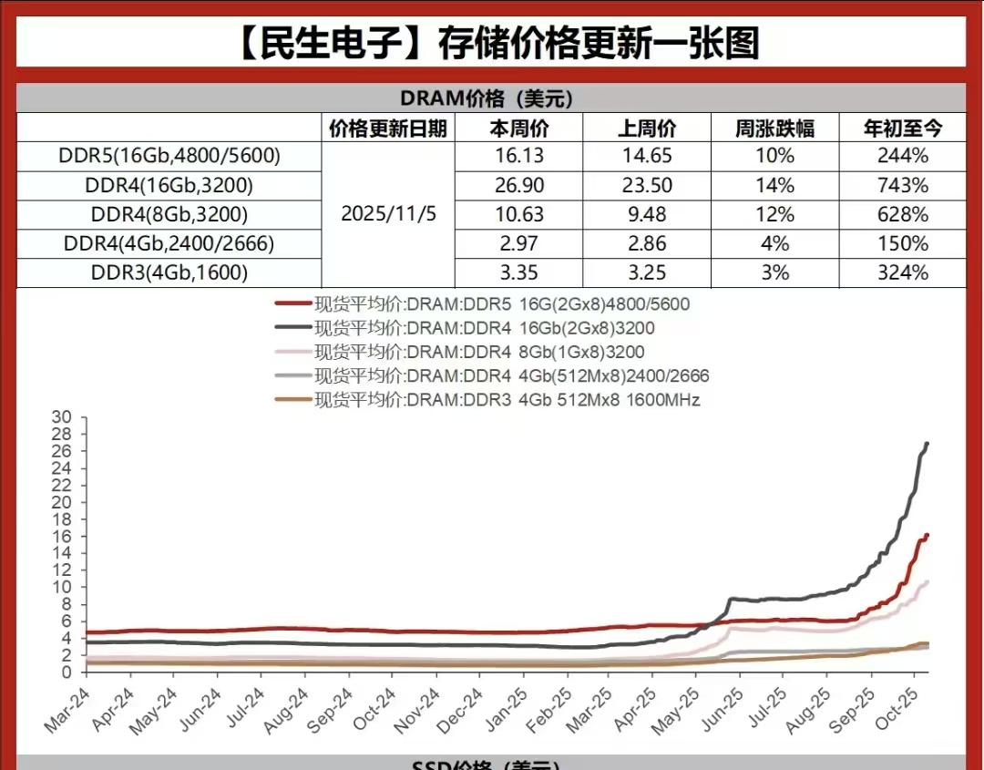 根据民生证券研究院整理的一份存储价格更新表,DDR4中4GB版本从年初到11月5日的涨幅为150%,而8GB和16GB版本的涨幅则高达628%和743%,近一周涨幅也普遍在10%以上。从价格看,DDR4的16GB的价格为26.90美元/颗,几乎是8GB的三倍。
