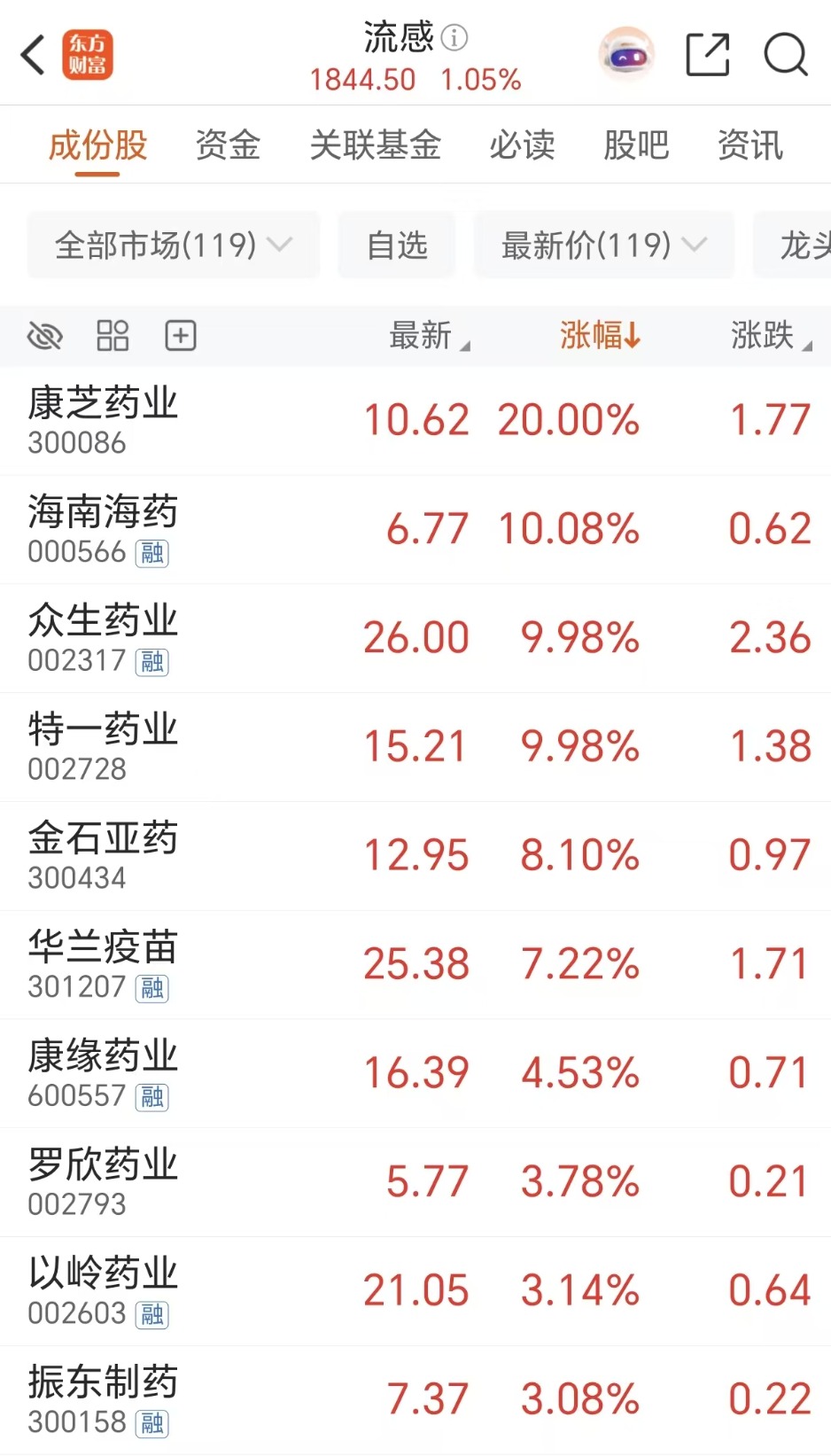 周五(11月14日)抗流感概念爆发,个股方面,康芝药业、金迪克20CM涨停;众生药业、特一药业等多股涨停,华兰疫苗、康缘药业等跟涨。