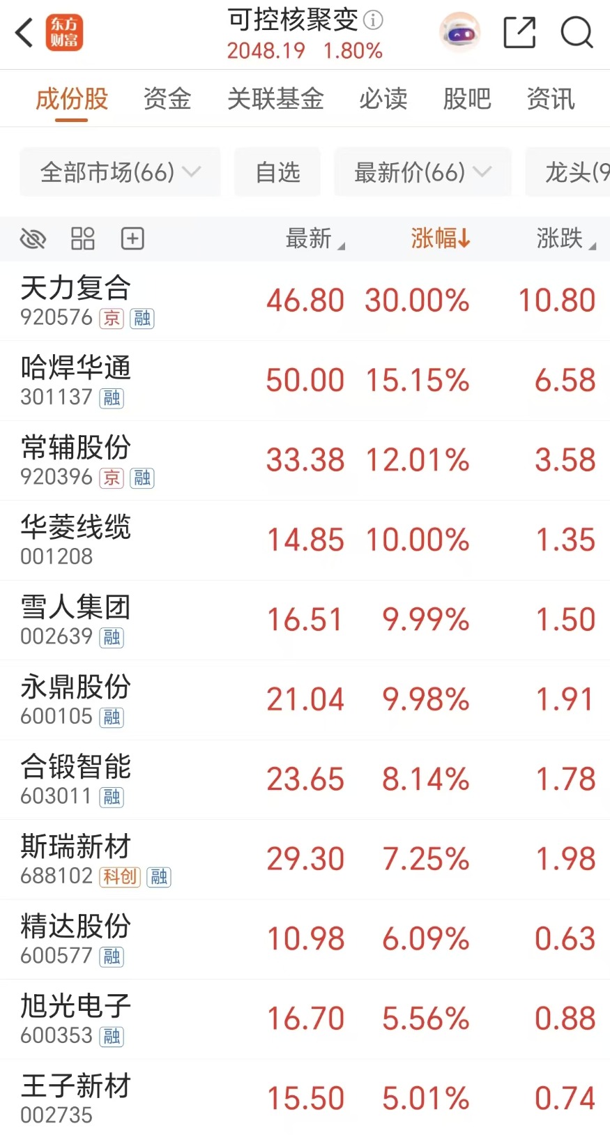 周四(12月11日)可控核聚变概念逆势大涨近2%,天力复合30CM涨停,哈焊华通涨超15%,华菱线缆、永鼎股份等涨停。