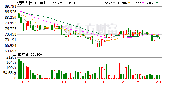 证券时报·数据宝统计,德康农牧在港交所公告显示,12月12日以每股70.250港元至71.750港元的价格回购5.82万股,回购金额达411.40万港元。该股当日收盘价70.500港元,下跌1.81%,全天成交额2293.73万港元。