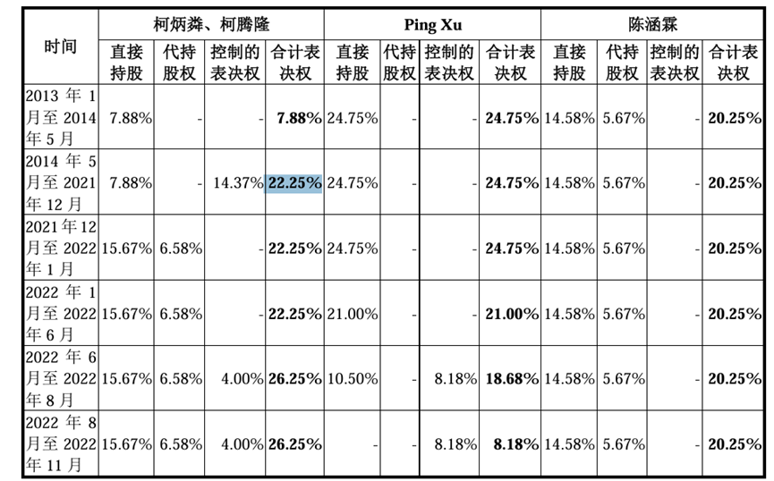 一番操作之后,徐平已不再直接持有公司股权,而是通过其配偶控制的平台拥有公司6.50%的表决权。至2022年11月,柯炳粦父子直接持股上升至12.67%,控制的表决权为26.25%。
